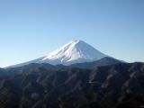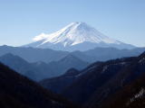 大滝不動尊の石段が氷の斜面に変わっているので滑り止めを装着して慎重に進む。正面の男滝も右の女滝も凍結している姿に冬山の醍醐味を感じながら氷点下の道を先に進む。急勾配が続くかと思ったが文殊堂からは平らにトラバースして展望台脇の林道に到着する。ここからの展望が悪いのはネットで調べて通りであり落胆せず林道で標高を稼ぎ始める。早朝の北斜面の林間を歩いているのでずっと薄暗い中で有ったが、山道に入り稜線に出たところで一気に明るくなる。山頂と反対側に富士見台があるので迷わずに立ち寄る。富士山は御坂山に裾野が隠れて迫力不足であるが、甲府盆地の向こうに広がる南アルプスの大展望に満足し、大休止をする。