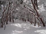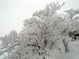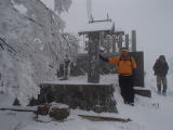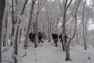 登山口の標高を600m以上と勘違いし、標高差600mなら1時間半程度で山頂に着くと思っていたが、温泉の標高は470mに過ぎず、標高差は778mとなる山頂には12:10に到着した。軽アイゼンは最後まで着けることなく登り終えてしまったし、踏み固められているので長靴が必要なほど深い雪でもなかった。山頂の展望は全くなかったが、綺麗な樹氷が見えているから特に不満も無い。