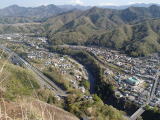 ここからは岩山なので厳しいコースと成るのでは、と覚悟しながら先に進むがコンクリートで階段が作られ鉄製の手すりも完備された極めて安全な山道である。休み休み登りながら、扇山から百蔵山への稜線を振り返り見て、今日は長距離を歩いているなと実感しているうちに最高地点の分岐に進み、急坂を詰めて電波塔の建つ岩殿山[634m]の峰火台には14:58に到着した。展望がよい場所は別にあると聞いていたので山頂を直ぐに過ぎ、鏡岩の直情広場に着くと石を投げれば高速道路の車に当たるほど直下に切れ落ちた断崖の上に出る。大月の市街も足下に広がり、夜景も綺麗だろうなと思いつつ一休みを入れる。