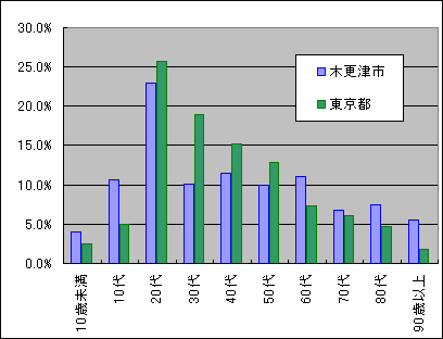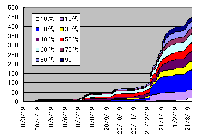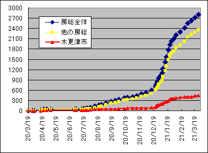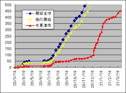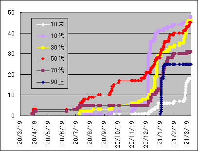| 一日当たりでは10.75人で依然として2桁を下回っていない。これをグラフにすると下図の通りである。 ![]() この様に一日当たりの増加数が一定なのでグラフの傾きも下図のようにほぼ一定で増加している傾向が続いている。 ![]() 一方で木更津市の部分は今まで落ち着いて値が今回急に増加している事が明かである。保育園で発生したクラスターも影響しているが、一刻も早い沈静化を願うところである。 ![]() 木更津市のグラフを年齢別に区分けしたものが下図である。 ![]() 特徴的な動きは大学のクラスターが出た10代、特養のクラスターが出た90代以上、保育園のクラスターが出た10歳未満で示しているので、それに30代、50代、70代のデータを加えて年代別の累積感染者数グラフを作成してみると下図のようになる。 ![]() 50代は継続的に増加しており、30代は10代に影響されるように増加し、70代の増加後に90歳以上のクラスターが発生したことがグラフからは見えてくる。また10未満の増加に伴い30代が増加しているのは家庭内感染が生じているためと推察される。 因みに木更津市内の感染者数の年代別割合を一昨日の東京都のデータ(3月27日現在で年齢が明かな119,650人)と比較すると下図のようになる。 ![]() 都内と比較すると10代、60代、90歳以上で比率が高く30代から50代にかけて少ないことが解る。働き盛りの世代が感染しないように自粛してくれている事だと推察でき、感謝する次第である。 緊急事態宣言が明けても多くの会社や組織で感染対策が継続され、宴会等の自粛は続いているとも聴く。飲食店の苦境は続くがリバウンド防止のためには致し方ないように感じている。 現在読んでいる「新型コロナの科学」(黒木登志夫著:中公新書)から知識を深めて、それを周辺に伝え、誤解や偏見の無い世界を作りながら収束の日までを乗り越えていこうと思いつつ、今回の記載としたい。 |