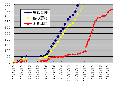 | この8日間では一日当たりで13.00人の増加であり、今までと傾向に大きな変化がない。従って累積のグラフにすると下図の通り一直線に増加している事が解る。 ![]() 木更津市の部分では、また落ち着きを取り戻しているように見られるが、緊急事態宣言解除の影響が今週から出始ると思われるので今後の値の推移が心配である。 ![]() 緊急事態宣言が明けて2週間が経過したが、今はまん延防止等特別措置に入る3週間前なのかと考えると気が重い。ワクチン接種で感染が減り、医療の負担が減ることでインフルエンザと同じ程度の危機感になり、社会が平穏を取り戻して欲しいと願いながら今回の記載としたい。 |