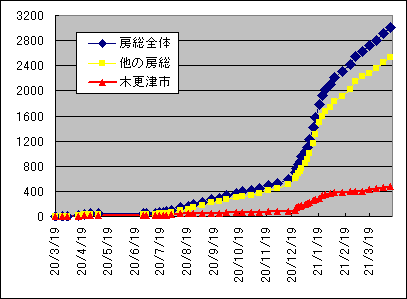 | 人口が少ない自治体で大規模なクラスターが発生した自治体は順位が上位になる傾向があり市中の感染状況を示したものではない事は考慮する必要がある。赤色に着色した7自治体は累積感染者数が千人を超えた自治体で、単に人口が多いから感染者が多いのではなく比率でも上位に位置していることが解る。 仮に千葉県で蔓延防止等重点措置が講じられた場合、これらの7自治体に習志野市と流山市を加えた9市か、更に我孫子市と鎌ヶ谷市を加えた11市とすることが妥当だと思われる。数値の上からは成田市・富里市・酒々井町といった成田空港の影響の多そうなエリアも感染が広がっており、それに隣接する佐倉市・八街市・栄町の4市2町を加えることも不思議ではない。 黄色に着色した自治体は私が「房総半島26市町村」として集計している人口約112万人のエリアである。木更津市も感染が進んでいるように思えていたが県下で27番目で、人口あたり感染者数は房総半島全体より高いが千葉県全体よりは低い値であった。 なお、テレワークの発達で都心を離れて生活するものが増えていると言われているが、房総半島では8,571人、率で約0.8%の人口減少となっていた。人口が増加した自治体は11箇所で、木更津市も421人ほど増えているものの、流山市の4,616人に比べると僅かなものである。今回のデータで流山市と2,416人増加した八千代市が20万都市に名を連ねていた事にも驚かされた。 黄色の26市町村で4日から昨日までの8日間で91人の増加があり、累積で3千人を超えてしまった。因みに3千人を超えていない都道府県は25県もあり、人口180万人を越える岡山県や福島県より早く到達している。房総半島と言えども首都圏であり東京の影響は無視できないことが明かである。 |