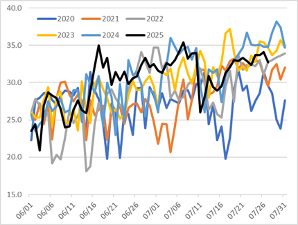 | 北海道北見市で39℃を記録し、国内各地で熱中症患者数が急増し救急隊の出動が逼迫するなど、毎年確実に気温が上昇してきている感覚がある。しかし、よく考えてみればここ数年は毎年猛暑であり、特に2018年は日本各地で40℃を超える気温が観測されていたことを思い出すと、今年はまだ40℃に達していないだけ良いと思うべきなのだろうか。 ともあれ今年の傾向を見るために2020年以降の6月と7月の最高気温を調べてグラフを描いてみたものが下図である。 ![]() 今年は6月後半から真夏の暑さが続いていたがここ数日は例年通りの暑さに成ってきたという感じである。そうは云っても多くの日が30℃を超える真夏日であり、これから更に厳しさを増すと思われる8月が目前であり、残暑もどれだけ続くか解らない。 気温が低い日が少ないということは、最高気温の合計値で計算される積算気温が高くなることであり、6月1日から昨日までの値を集計した結果は下表のようになった。 |