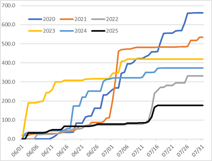 | この値が毎年確実に上昇している所に、今年は前年より暑いと感じる感じる要因が有りそうだし、実際に休む間がないということは体力も奪われるだろう。 ともあれ高齢者の方々には公民館や図書館などのようにエアコンの効いた公共施設で読書やおしゃべりを楽しむなど、熱中症予防を心がけ、夏を乗り切って欲しいと思う。 今年の特徴は梅雨時に降雨が少なかったことである。最高気温同様に、6月1日以降の降水量を累積値で求めグラフにしたものが下図である。 ![]() 約2か月間でも177[mm]しか降っておらず、灌漑が充分でなくて降雨に頼る田畑は死活問題だろうし、個人の花壇や庭木に水道で散水している場合は水道代が高くつくだろうし、そもそも散水に使用できるほど、亀山ダムなどの貯水率に余裕が有るのかと思い千葉県庁のHPを確認したが、上流で雨が降ったのか、7月22日時点での貯水量(単位立方メートル)は下表の通りで、今のところ節水制限を発令するほどの状況には成っていないようだ。 |