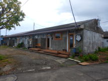 | 屈曲する車道をショートカットする階段を上り市営住宅の案内看板の所に着くが駐車禁止を知らせる補助看板があるだけで、まちびらきを終えた感覚も伝わってこない。案内図を見ると3本の道路が住宅地に設置されているが、2本は階段で接続されており車両での利用を前提としていない構造に設計の古さを感じる。 しかし団地の中に入ると現場見学をしていると思える6人ほどの若者が説明を受けており、住居を改造している工事中の家屋も少なくとも2棟確認できて、確かに人気なのだと理解する。更には、木更津市にも存在していない木造平屋の壁を新しい木の板で補修している姿には古さを通り越してテーマパークのような感覚を受ける。この様な建築様式を見ていない若者には異空間と思えて人気が出るのだろうかと考える。木更津の市営住宅と同じようなブロック造でも改修が行われており、残念ながらこの日は閉店であったが既に店舗が営まれているようであった。 多くの建物には車を停められる空間が無いため一団の建物から離れている5棟、8戸を解体して駐車場用地として確保してあり、この日も見学者や工事関係者などと思われる10台以上が停めてあったが公式HPでは車で来ることは遠慮願っている。 |