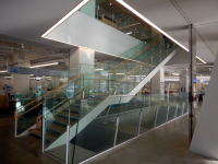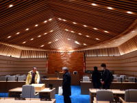 財政力に余裕のない尾道市としても日建設計と共に建設費の低減を目指して計画されていた吹き抜け空間を廃止して各階の床面積を増やすことで5階建てを4階に変更し執務室の床は打ち放しで天井材は設けず通信や電気配線は天井の枠から引くという省力化である。環境対策は諦めてZEB対応はしておらず節電や創エネには力を入れていない。それでも免震構造を採用し議場の天井は船底をイメージさせる木工とするなど必要な場所には資金を投じている。それで地下駐車場2,585㎡を含む延べ床面積14,497㎡の庁舎が旧庁舎や公会堂の解体工事を含み72億57百万円で成し遂げられたことのヒントを聞きに行ったのであるが、77億円の建築予算であったものが入札の結果59億円となり大幅な入札差金が出たことがコストカットの理由と聞き拍子抜けする。落札した清水建設は住友系の企業で住友財閥発祥の地である尾道市とは縁が深いために頑張ったのではないかという推察であるが真実は解らない。