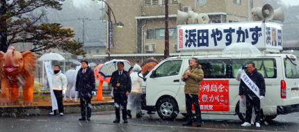 浜田選挙事務所に立ち寄り防寒対策の打ち合わせなどを行い帰宅して迎えに来た齋藤秀樹議員の車で16時の街頭演説が行われる袖ケ浦駅前まで行くと雪が強く降り始めた。粕谷市長に天候の話をすると15時の平川では傘に雪が積もる重さが解ったのでまだまだ良いと言われる。東北や北陸では連日この様な天候の中で選挙が行われるのかと思うとこの時期の解散は罪深いと実感する。昨日秋田県に応援に行っていた浜田代議士も地元で雪を見るとは思わなかったと言われていた。